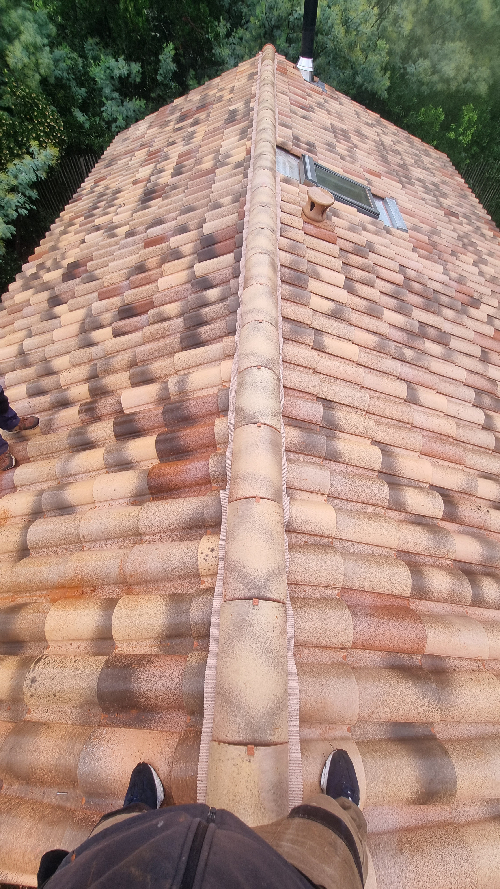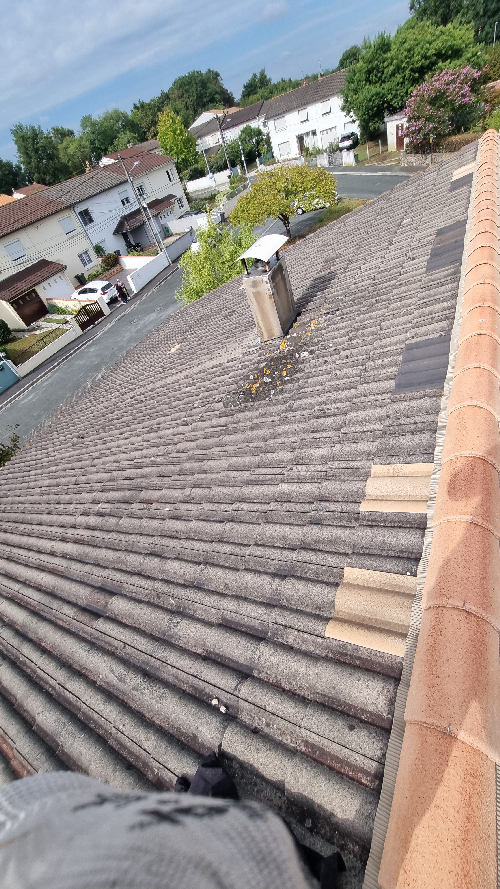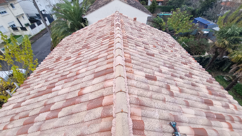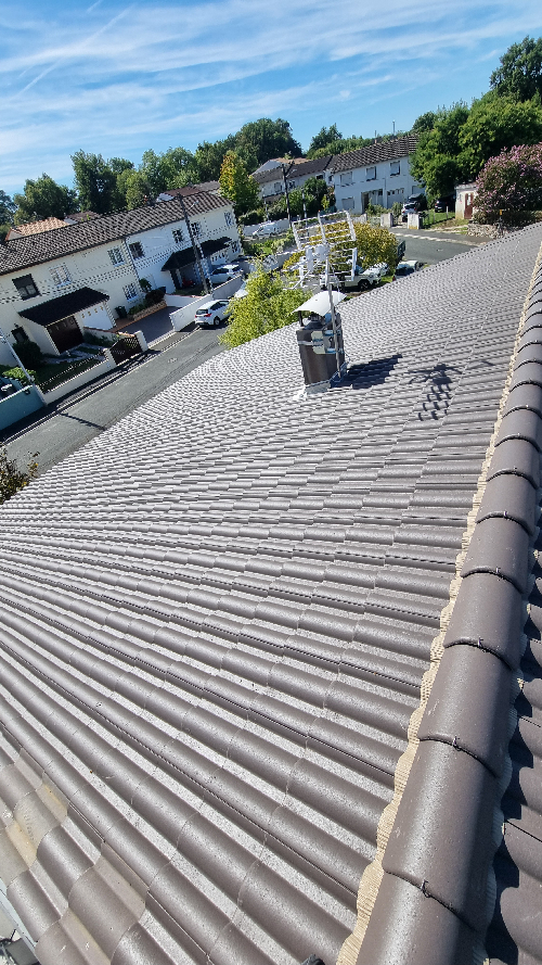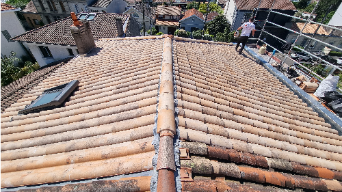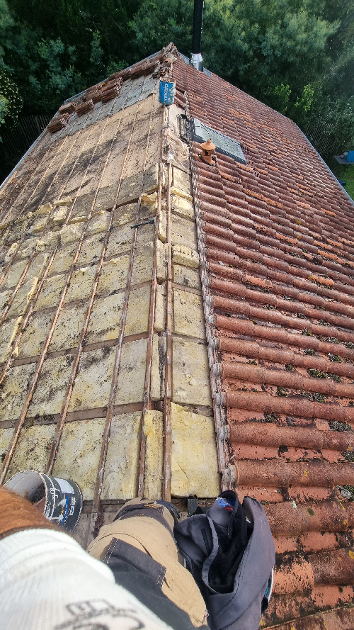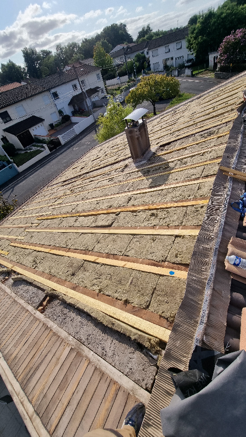 Dépose des tuile abîmées et poreuses et des liteauxPose d'un écran sur toiturePose de contre liteaux et liteaux neuf puis pose des nouvelles tuiles