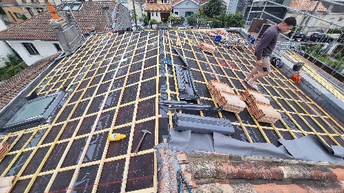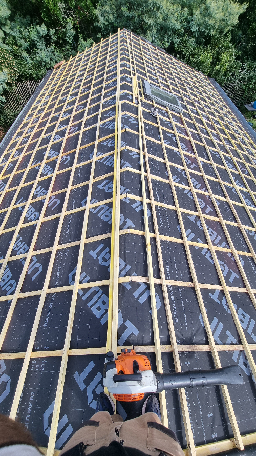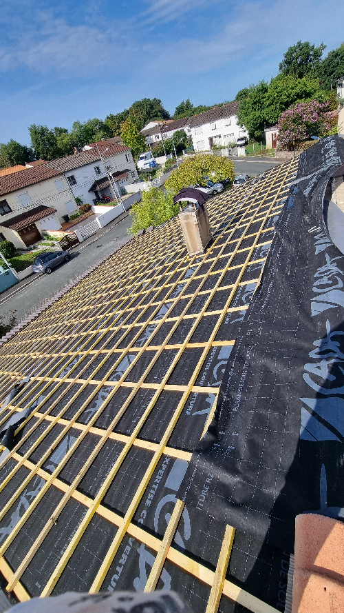 Dépose des tuile abîmées et poreuses et des liteaux Pose d'un écran sur toiturePose de contre liteaux et liteaux neuf puis pose des nouvelles tuiles